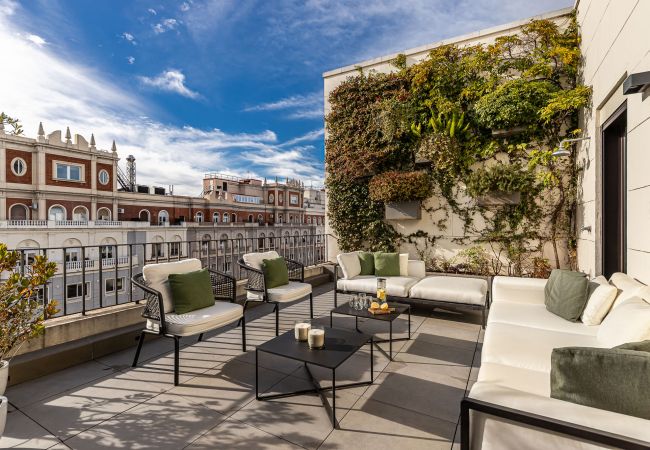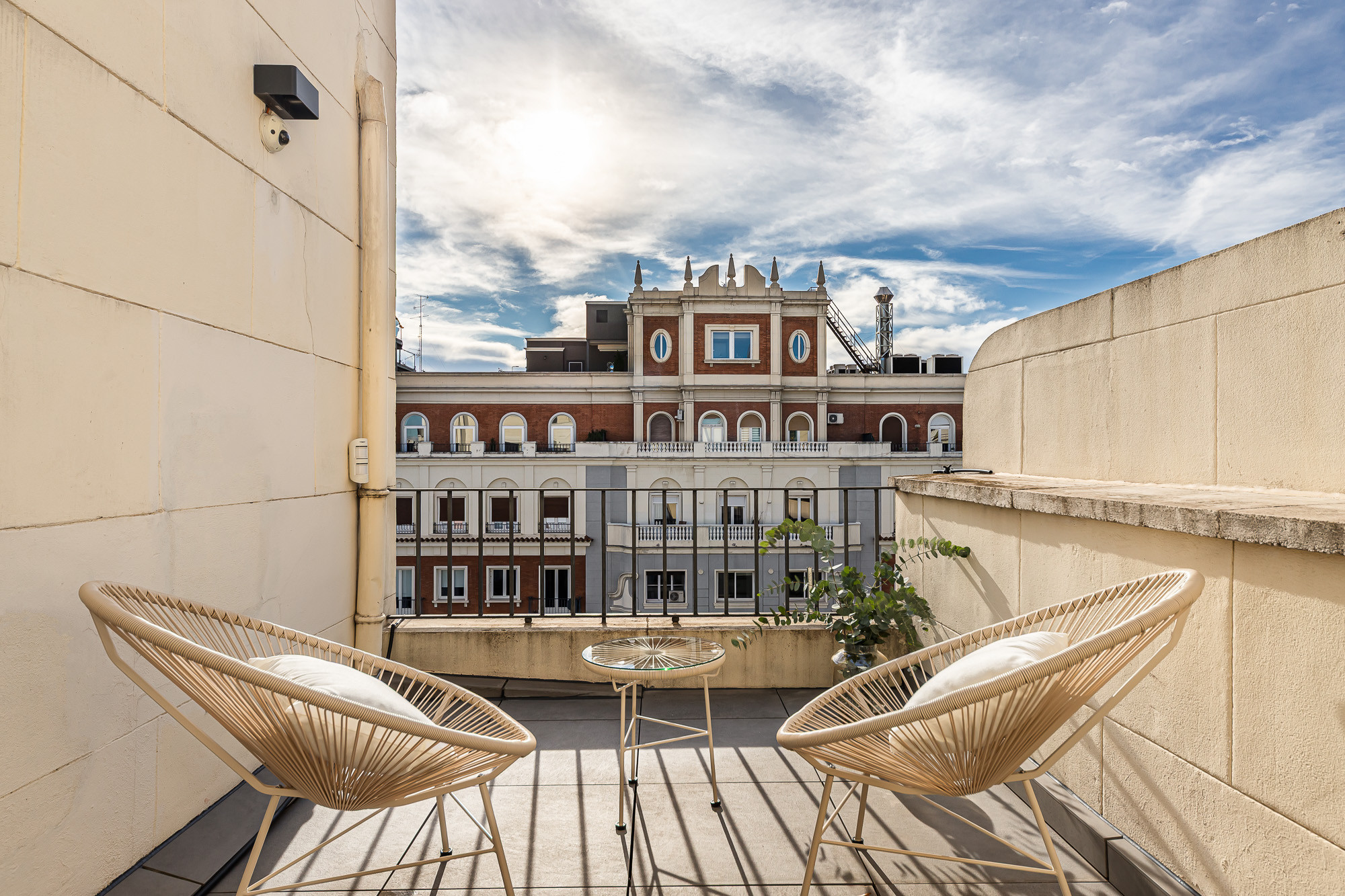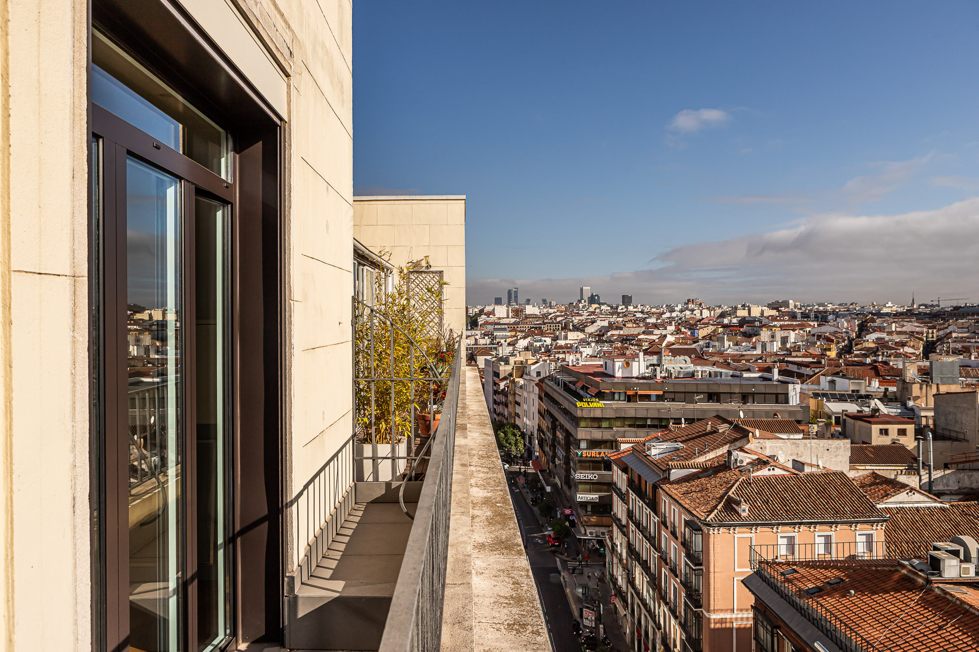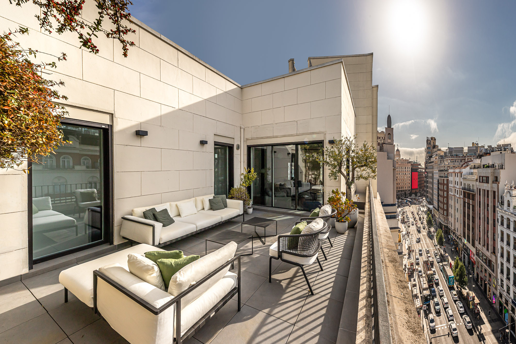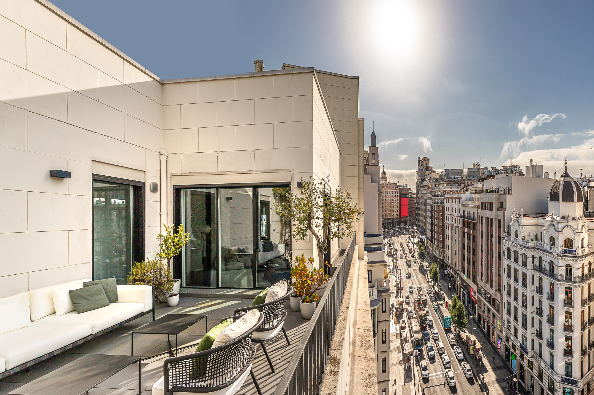 Ático de lujo de 250 m² (2700 sq ft), última planta, ubicado en la calle más emblemática de Madrid, la «Gran Vía». Dispone de 2 terrazas privadas, 6 balcones y unas impresionantes vistas panorámicas de 360 grados sobre toda la ciudad: desde los rascacielos del distrito financiero al norte, atravesando prácticamente toda la Gran Vía, hasta llegar a las montañas del sur. Además, cuenta con un amplio espacio diáfano de salón–comedor–cocina, 4 generosos dormitorios y 3 baños completos.