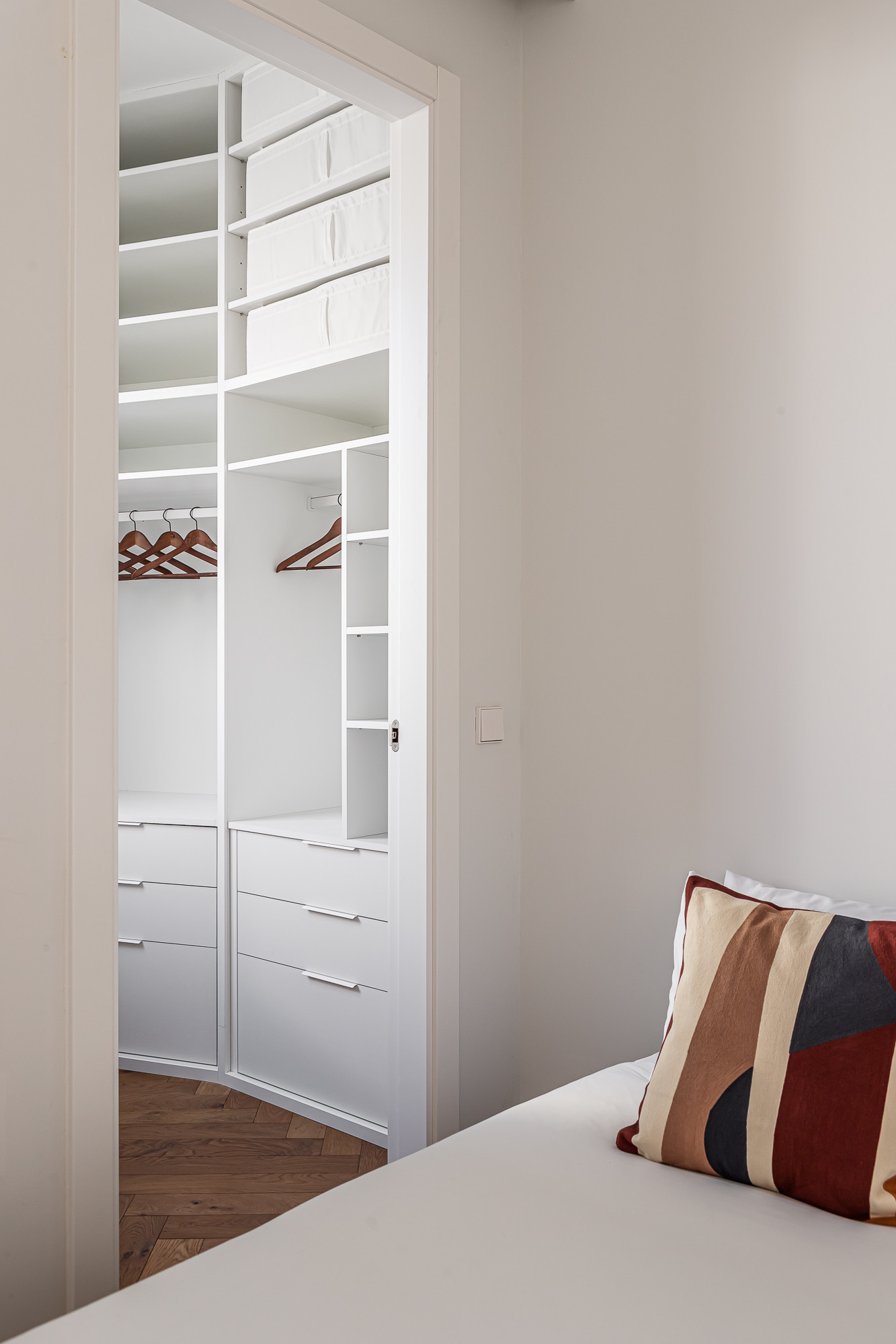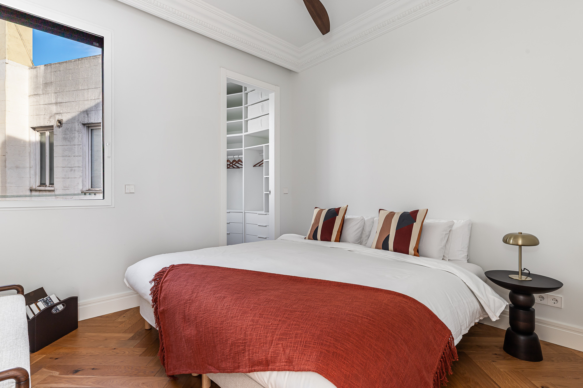 - Dormitorio nº 2 con cama XXL, amplio espacio de armarios y un balcón tipo julieta que da directamente a la Gran Vía