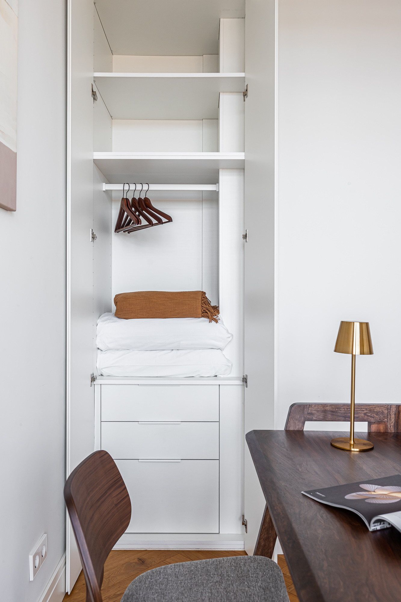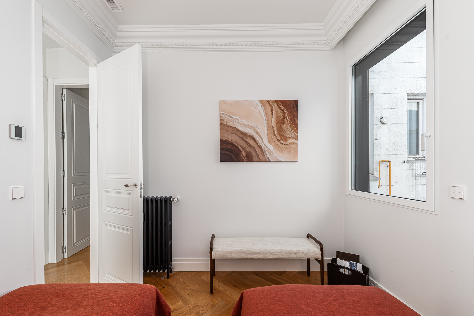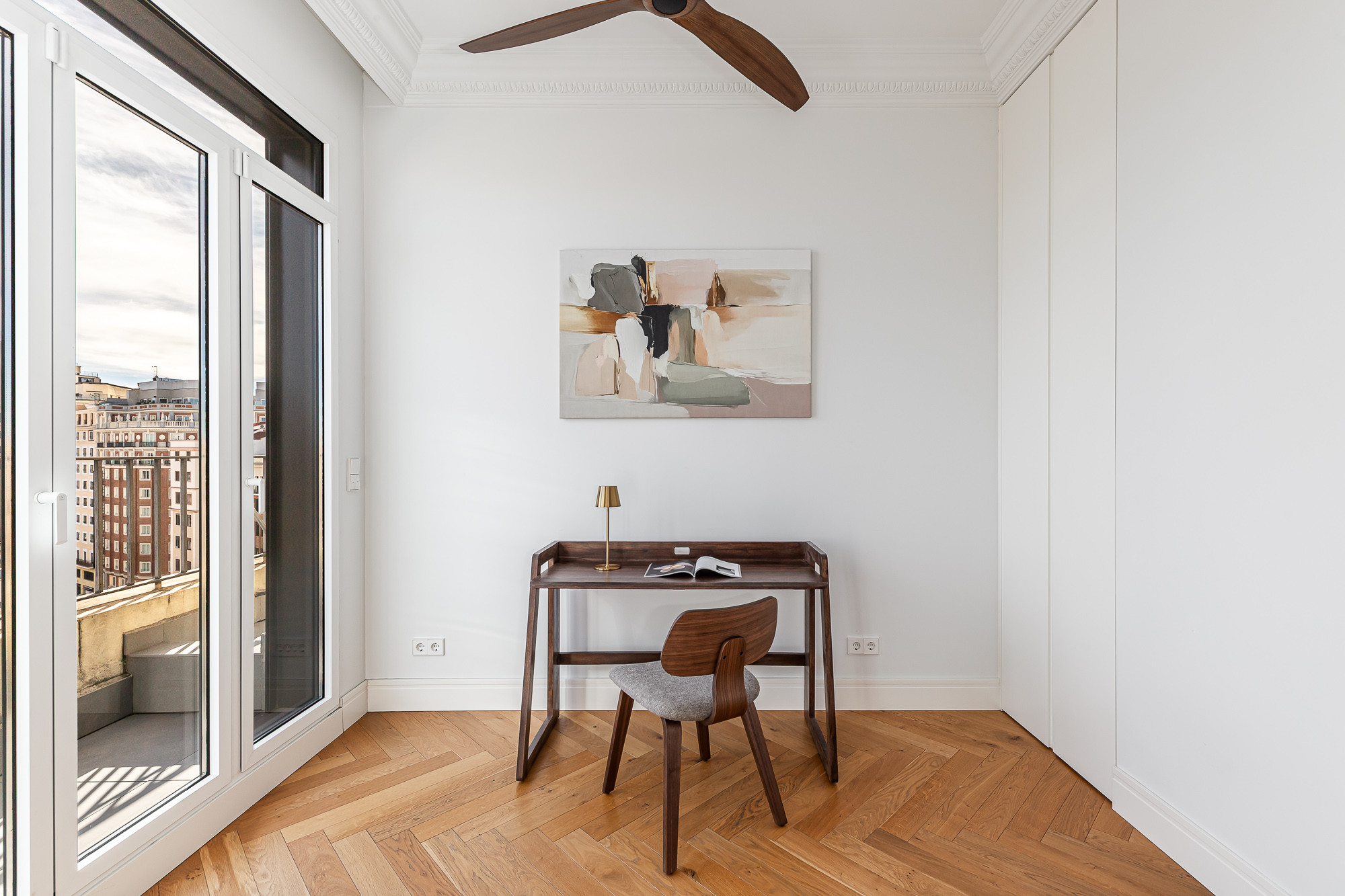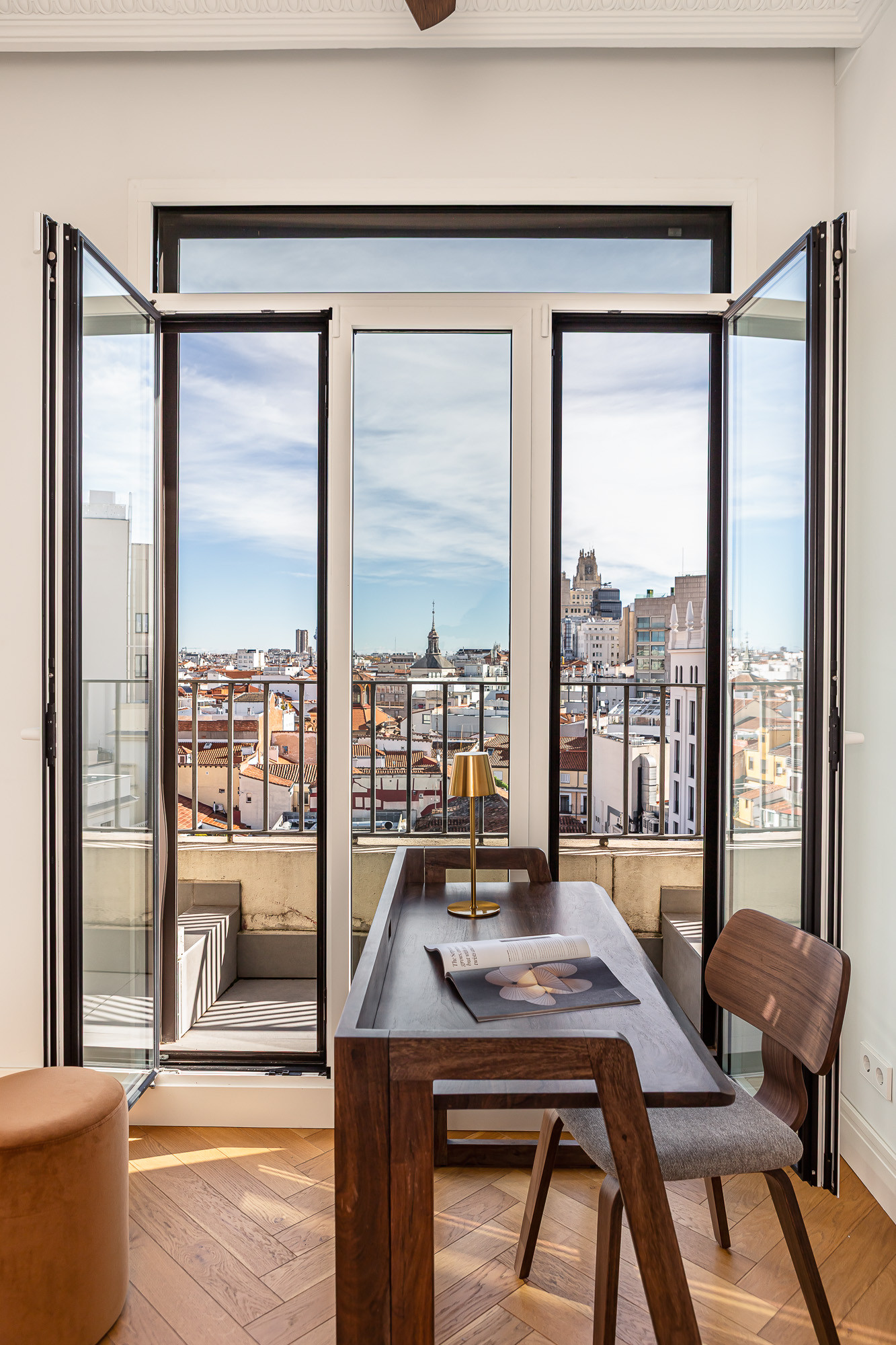 - Dormitorio nº 4 con cama abatible y un cómodo colchón doble, escritorio de trabajo, armario y un balcón privado con impresionantes vistas a los tejados de Madrid, que se extienden hasta los rascacielos del distrito financiero al norte — especialmente mágico al amanecer